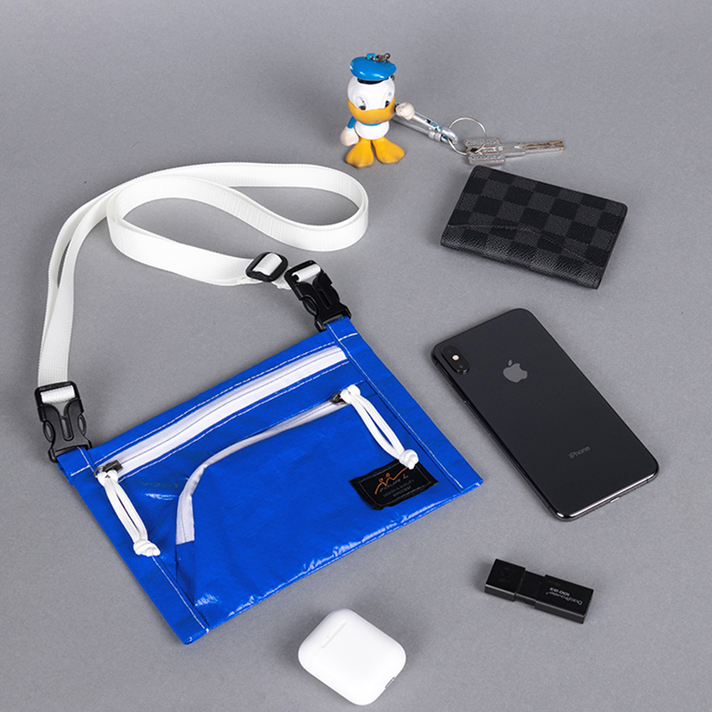 This cute storage bag may serve as a mini shoulder bag with a detachable webbing strap or just a storage bag securing small items in your backpack.